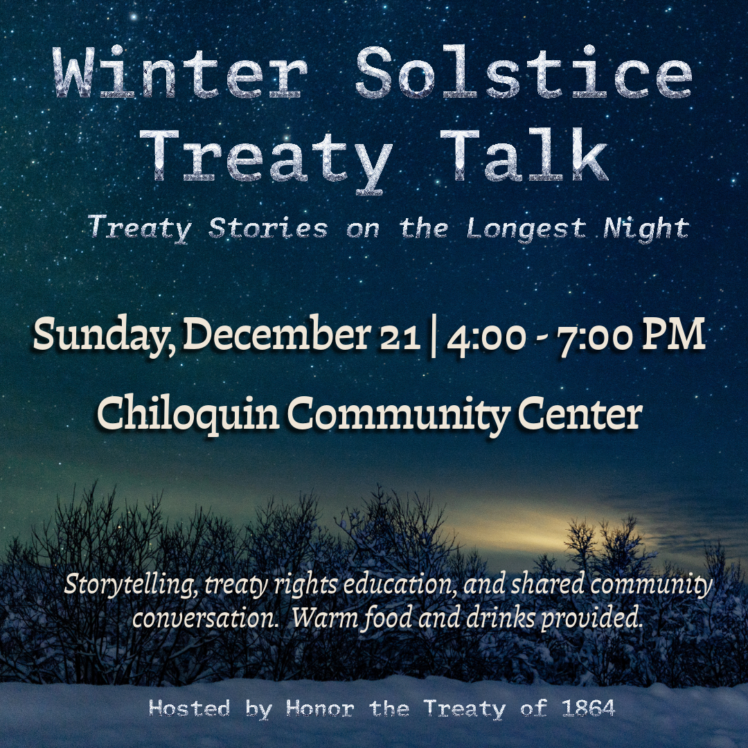 Join us for a small, informal evening gathering focused on treaty rights education and storytelling. We’ll talk about the Treaty of 1864—what it says, why it still matters, and how treaty rights show up in everyday life today.